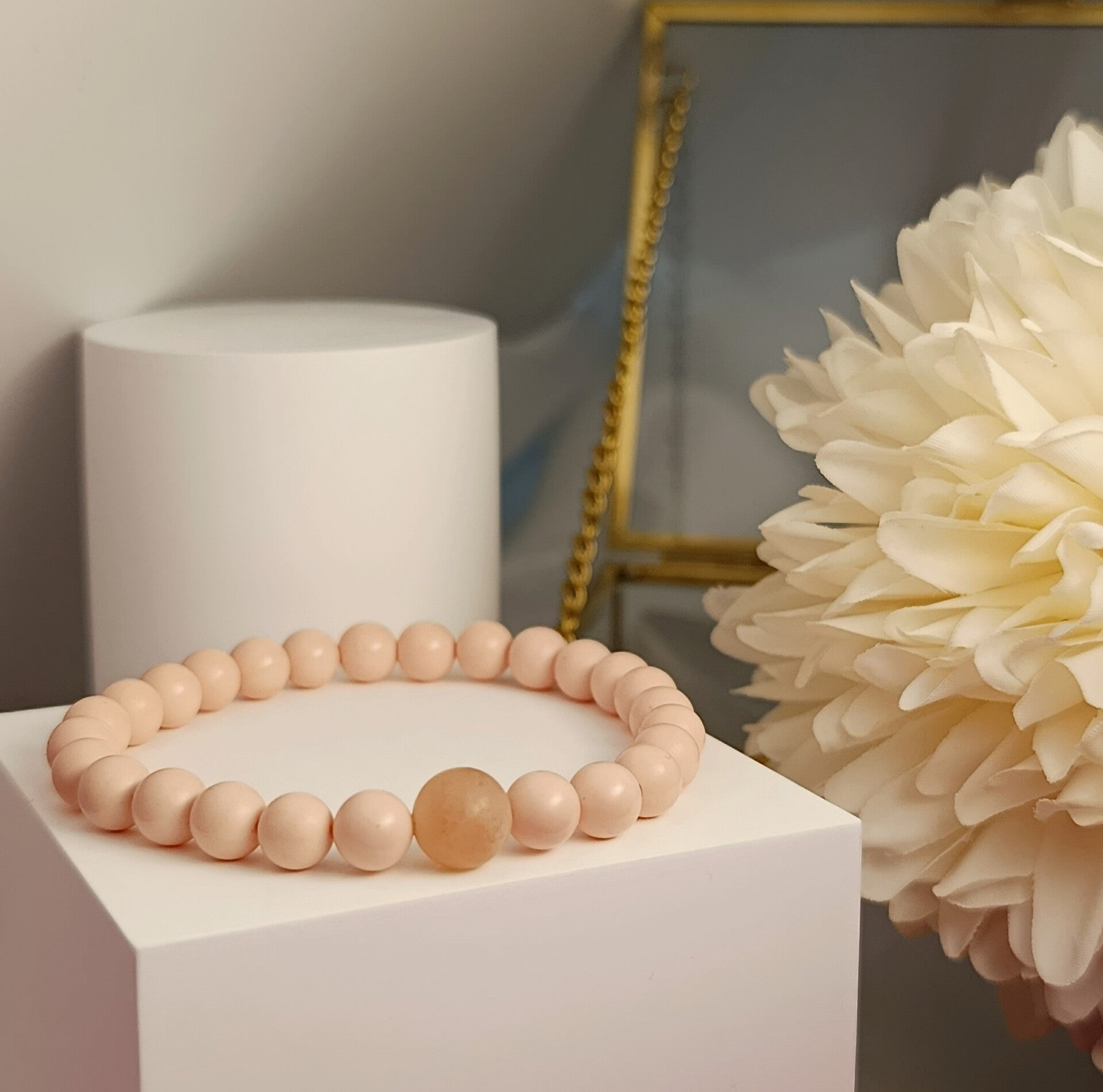 Delikatna, kobieca i pełna blasku – bransoletka Emma to połączenie ciepłego odcienia awenturynu brzoskwiniowego z subtelnym połyskiem muszli perłowej. Ta wyjątkowa kompozycja kamieni naturalnych emanuje spokojem, wdziękiem i pozytywną energią.